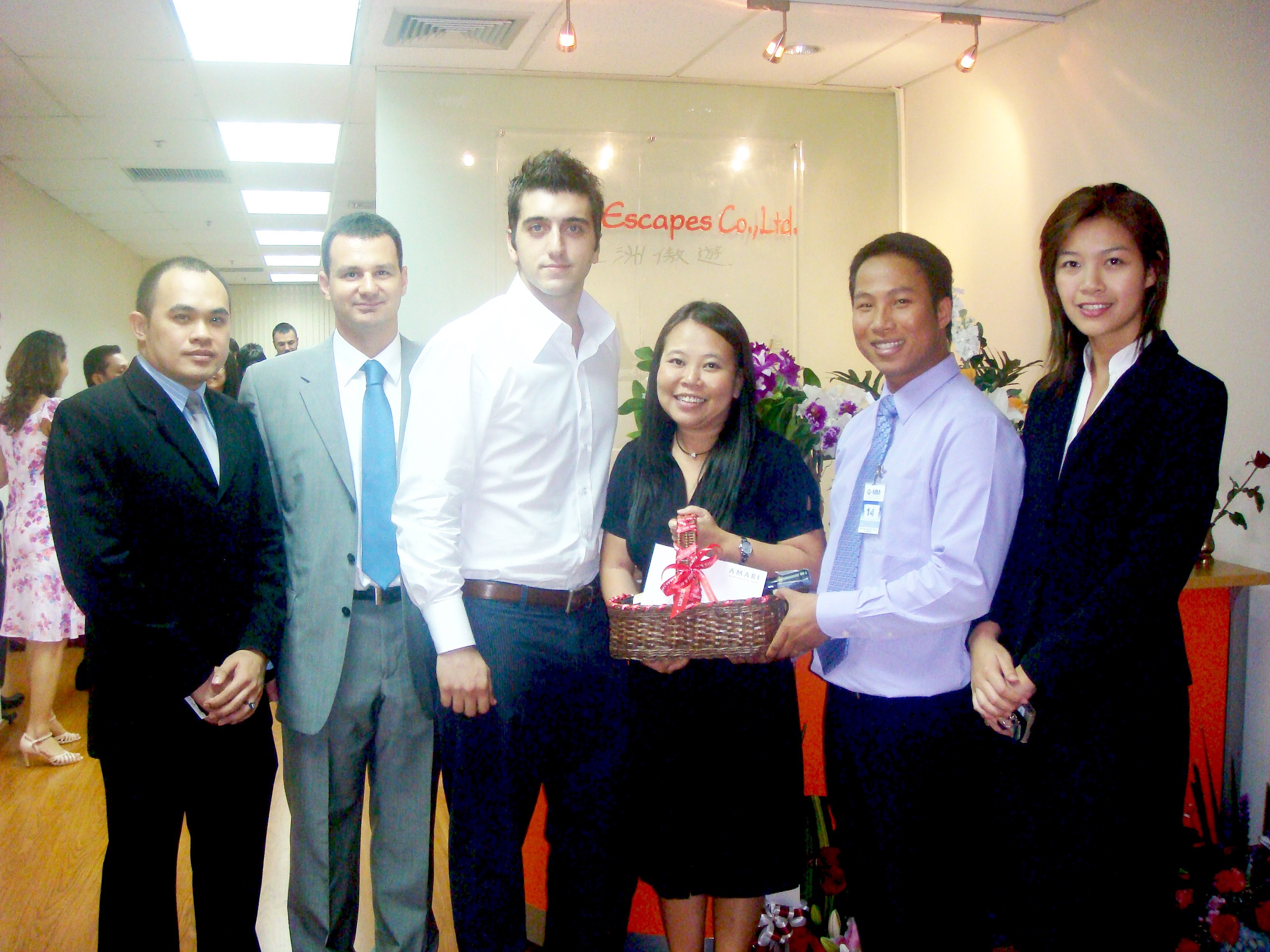 AMARI celebrates Asian Escapes 10th AnniversaryThe Sales & Marketing Team of Amari Orchid Resort & Tower, Pattaya, led by Dhaninrat Klinhom (2nd right), Director of PR, recently presented a courtesy basket to General Manager, Ms. Lam Laileng (3rd right), of the famous far east tour operator Asian Escapes, to celebrate its 10th anniversary at GMM Grammy Building, Bangkok.Photo from left to right: Khun Nithipat Watthanadech, Sales Manager; Mr. Gokhan Sinar, Senior Manager of Asian Escapes Co., Ltd. Mr. Bora Ersu, Operation Excutive of Asian Escapes Co., Ltd.; Miss Lam Laileng, General Manager of Asian Escapes Co., Ltd.; Khun Dhaninrat Klinhom, Director of PR; Khun Thitiporn Boonsuk, Sales Manager of Amari Orchid Resort & Tower