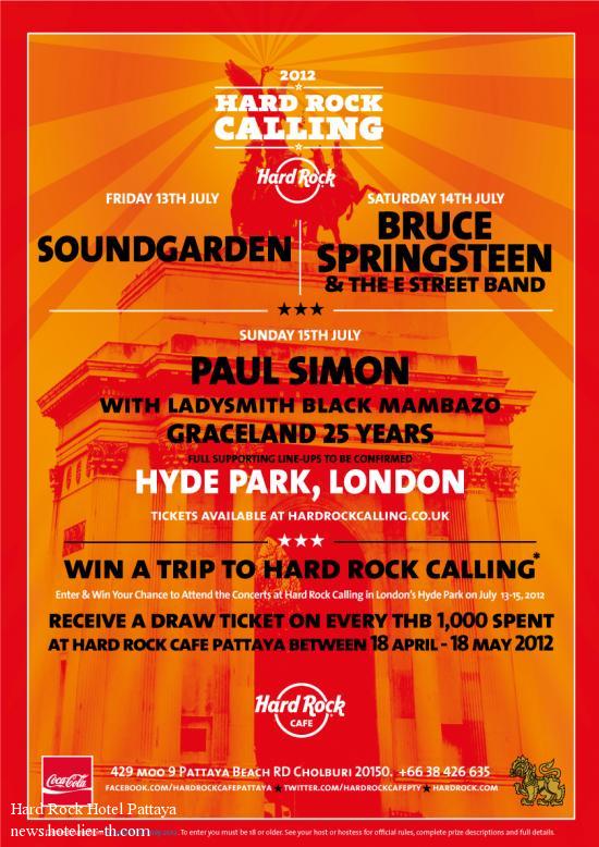 LONDON ROCKS THE WORLD THIS SUMMER AND HARD ROCK CAFE PATTAYA WILL GET YOU THEREWin a Trip to the Iconic Hard Rock Calling 2012 Music FestivalPattaya, Thailand, April 17, 2012 – London’s calling and you have a chance to answer! Hard Rock Cafe PATTAYA are giving fans an opportunity to win a trip to London for one of the world’s most-anticipated concert events – Hard Rock Calling 2012! To qualify for a chance to win a trip for two to Hard Rock Calling London. The package for two includes round-trip airfare; hotel accommodations for three nights; concert tickets for each of the three days of Hard Rock Calling 2012; and $300 spending cash. Moreover, there is also a 2nd prize of a 2-night stay at Hard Rock Hotel Penang, and a 3rd prize of THB 2,000 for dining at Hard Rock Cafe Bangkok. You will receive ONE draw ticket for EVERY THB 1,000 spent at Hard Rock Cafe Pattaya from now till 18 May 2012. The draw entitles to Thailand residents only. Hard Rock Calling, now in its seventh consecutive year, will take place from Friday, July 13, 2012, to Sunday, July 15, 2012, in London’s Hyde Park. The lineup for Hard Rock Calling 2012 features the world’s most iconic musicians and today’s hottest artists including Bruce Springsteen and the E Street Band, Paul Simon, Soundgarden and Lady Antebellum. 2012 performers will join a long line of rock ‘n’ roll greats who have previously taken the Hard Rock Calling stage including: Aerosmith, Eric Clapton, Neil Young, Paul McCartney, Stevie Wonder, The Who, Pearl Jam, Peter Gabriel, The Killers, The Police, Rod Stewart and Bon Jovi. Hard Rock Calling, produced by Live Nation and presented by Hard Rock International, is a unique and historic musical event in the center of London. For more information on the 2012 artist lineup and ticket details, visit www.hardrockcalling.com. Committed to supporting music and emerging artists, Hard Rock International hosted more than 17,000 live music events worldwide in 2011. The brand continues its dedication to live music in 2012 with its global Hard Rock Rising Battle of the Bands, which provides a forum to showcase today’s hottest up-and-coming talent and bring live music to fans across the world. Visit www.hardrockcalling.com for additional details. About Hard Rock International With a total of 174 venues in 53 countries, including 138 cafes and 16 Hotels/Casinos, Hard Rock International is one of the world's most globally recognized brands. Beginning with an Eric Clapton guitar, Hard Rock owns the world's greatest collection of music memorabilia, which is displayed at its locations around the globe. Hard Rock is also known for its collectible fashion and music-related merchandise, Hard Rock Live performance venues and an award-winning website. In addition to the two flagship Seminole Hard Rock Hotels and Casinos in Tampa and Hollywood, Fla., Hard Rock Hotels/Casinos are located in Las Vegas, Biloxi, Orlando, Chicago, San Diego, Pattaya, Bali, Macau, Penang, Singapore, Punta Cana and Panama. Additional hotel and casino projects have been announced including Cancun and Vallarta scheduled to open in 2012; and Riviera Maya, Hungary, and Abu Dhabi, scheduled to open in 2013. Hard Rock International is owned by Seminole Hard Rock Entertainment, Inc. For further details on Hard Rock Hotels and Casinos, visit www.hardrockhotels.com. For more information on Hard Rock International, visit www.hardrock.com.