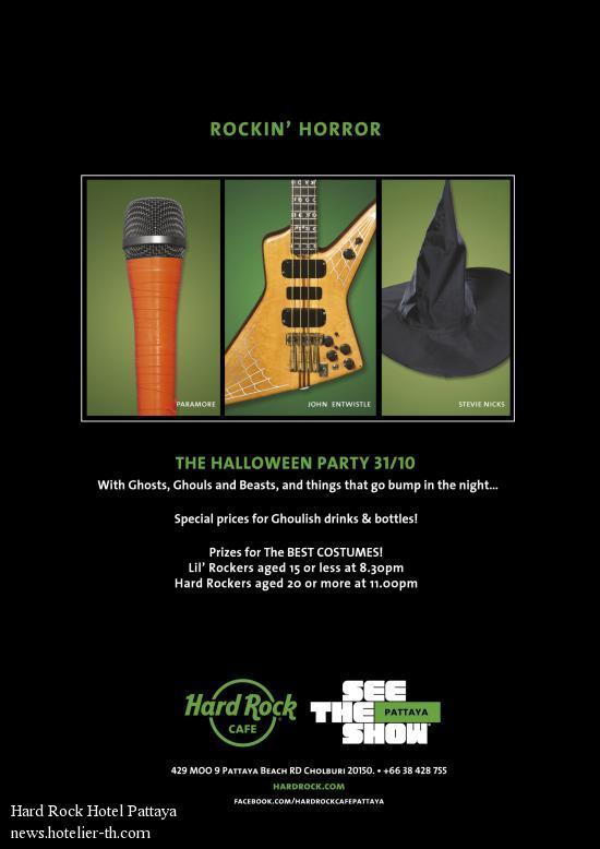 Rockin’ HorrorHard Rock Cafe Pattaya’s Halloween Party on Monday, 31st October 2011.With special prices for ghoulish drinks and bottles promotion! Come and participate in our Halloween costume competition for Lil’ Rockers (aged 15 or less) at 08.30 pm and for Hard Rockers (aged 20 and more) at 11.00pm. Prizes include cash. F&B voucher and hosted birthday party for 10 kids! For more information or registration, hit us at 038-426 635