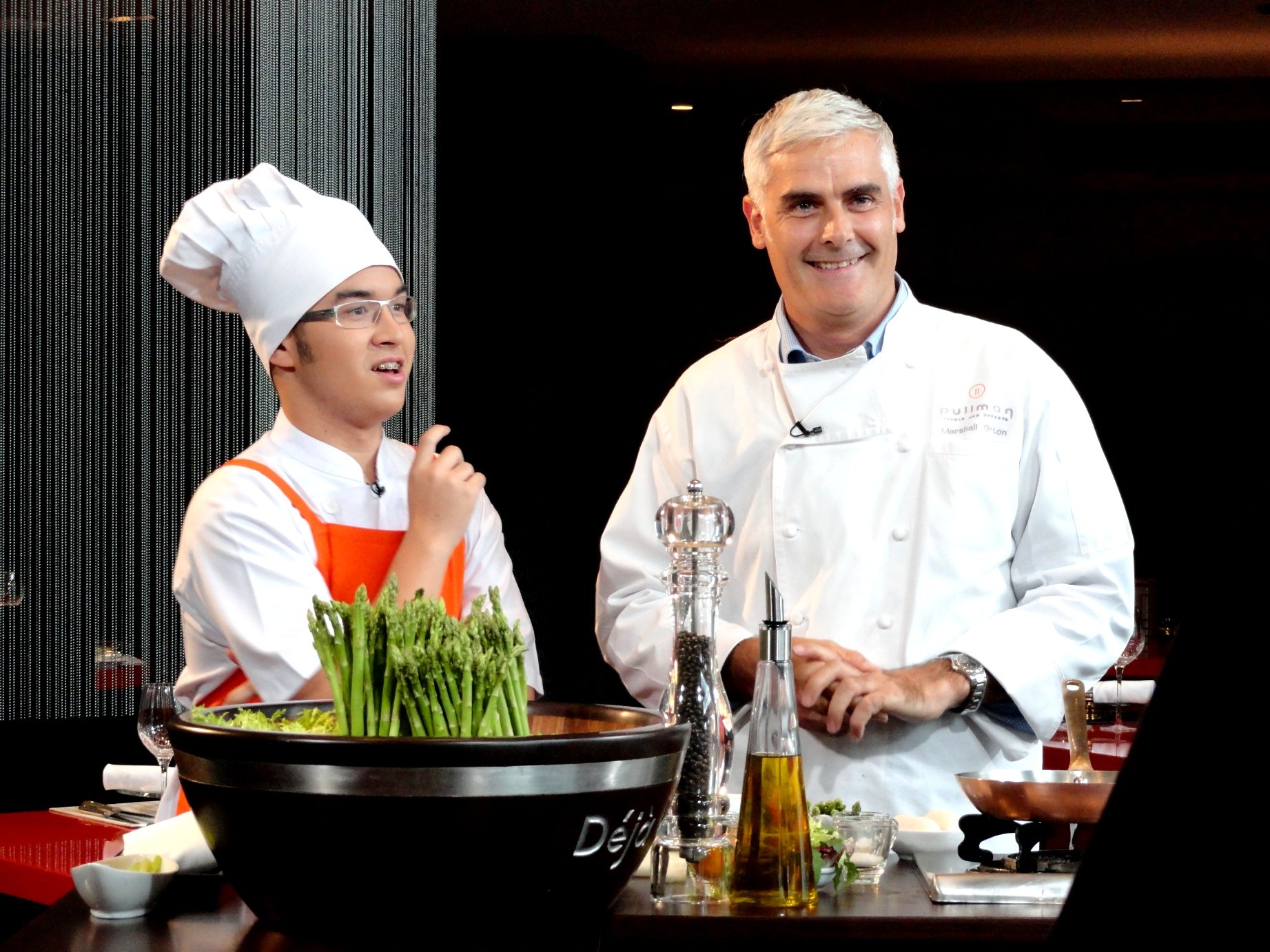 Chef Marshall’s signature dish shows on “English Breakfast” programExecutive Chef Marshall Orton (Center) of Pullman Bangkok King Power hotel shows how to cook his signature dish “Asparagus & seared US scallops Royal project tomato - herb vinaigrette” on English Breakfast program, interviewing by Khun Varin Patrick Mcbrain (right), a young moderator. The show will broadcast on Thai PBS channel, every Saturday and Sunday at 9:30 am to 10:00 am in September 2011, please stay tune!English Breakfast is a Thai TV program to teach English to Thais, mix between sitcom and news There are two young moderators, Khun Supol Kinsuwan (left) and Khun Varin Patrick Mcbrain (right).