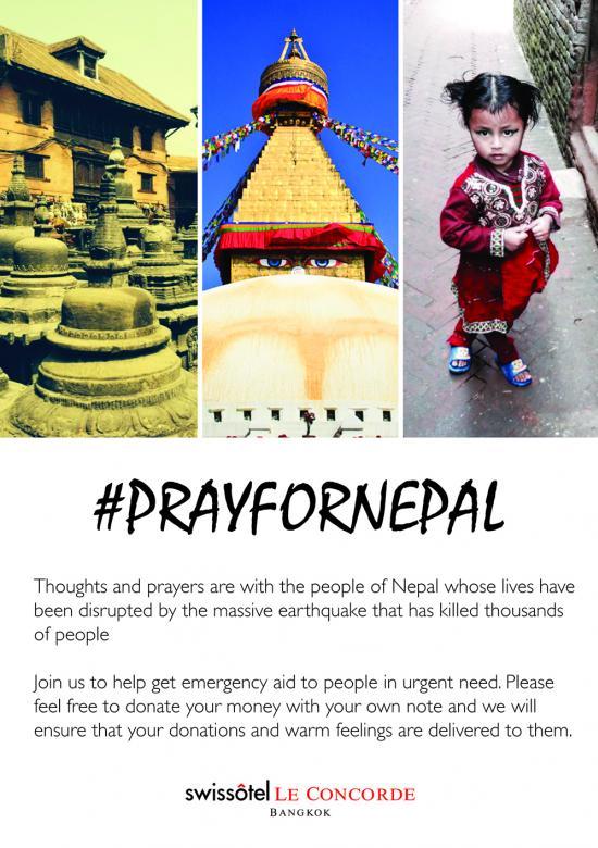 PRAY FOR NEPALThoughts and prayers are with the people of Nepal whose lives have been disrupted by the massive earthquake that has killed thousands of people.Join us to help get emergency aid to people in urgent need. Please feel free to donate your money with your own note and we will ensure that your donations and warm feelings are delivered to them. Please donate at Lobby, Swissôtel Le Concorde Bangkok from Now to May 15, 2015.