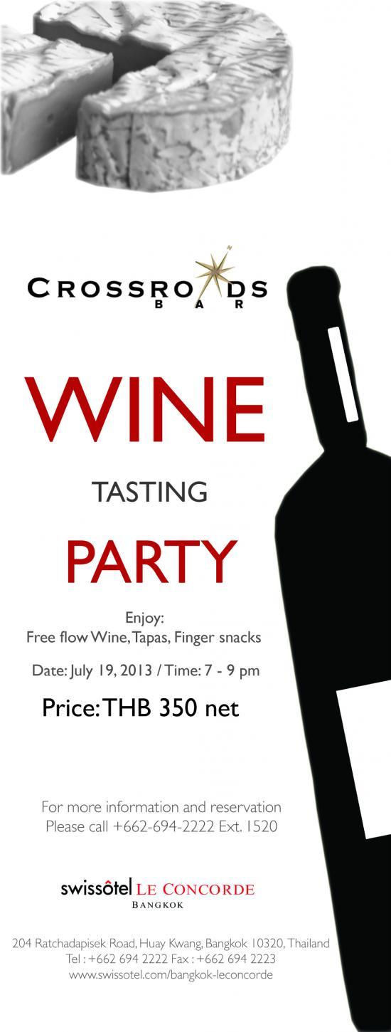 WINE TASTING PARTYBANGKOK, JULY – Attention! WINE LOVER, this month exclusive party you couldn’t miss. Crossroads Bar at Swissôtel Le Concorde Bangkok is proud to present Wine Tasting Party of the year only at THB 350 net per person.For those who can never get enough of wine, we are cordially inviting you to come join Wine Tasting Party at Crossroads Bar, enjoy Free Flow Wine, Tapas, and Finger Food from 19.00 to 21.00 hrs. on Friday 19 July 2013 only at THB 350 net per person. Crossroads Bar is located on the ground floor of Swissôtel Le Concorde Bangkok. Hours of operation: 10.00 a.m. – 01.00 a.m. For more information and reservation please call +662 694 2222 ext 1520.
