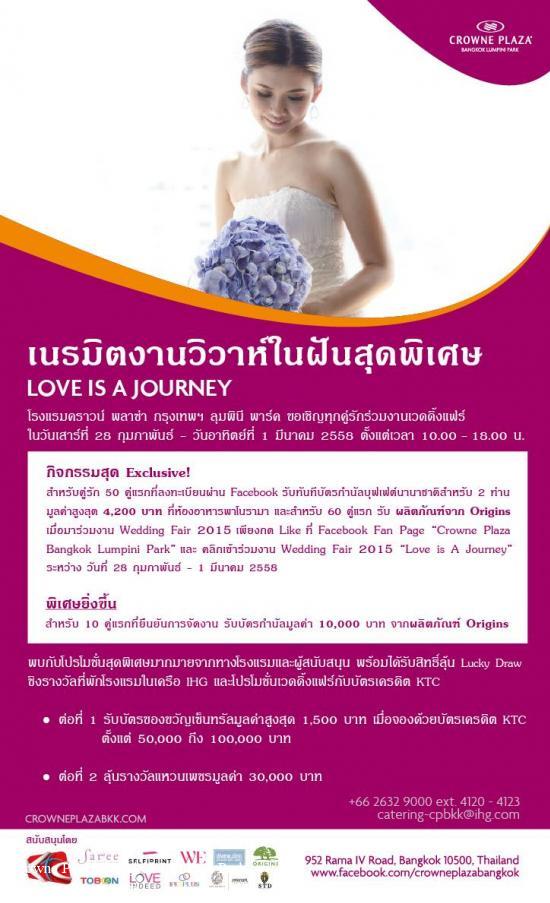 Crowne Plaza Bangkok Lumpini Park Wedding Fair : LOVE is... A Journeyเนรมิตงานวิวาห์ในฝันสุดพิเศษกับคู่รัก สู่ความทรงจำมิรู้เลือนในธีม “Love is a Journey” โรงแรมคราวน์ พลาซ่า กรุงเทพฯ ลุมพินี พาร์ค วันเสาร์ที่ 28 กุมภาพันธ์ และ วันอาทิตย์ที่ 1 มีนาคม 2558 ตั้งแต่เวลา 10.00 - 18.00 น. ณ ชั้น 21 มร.แซม เดวีส์ ผู้จัดการทั่วไป โรงแรมคราวน์ พลาซ่า กรุงเทพฯ ลุมพินี พาร์ค และ Area General Manager, IHG Bangkok เปิดเผยในพิธีเปิด เวดดิ้ง แฟร์ วันเสาร์ที่ 28 กุมภาพันธ์ 2558 ว่า คราวน์ เวดดิ้ง ทีม พร้อมต้อนรับและให้คำแนะนำทุกคู่รัก เพื่องานวิวาห์ที่ดีที่สุด ด้วยสิ่งอำนวยความสะดวกครบครันที่เข้าใจถึงทุกความต้องการของคู่รัก ให้งานวิวาห์ของคุณมีสีสันและแปลกใหม่ไม่ซ้ำใคร ด้วยดีไซน์ที่ทันสมัยของห้อง เดอะไวท์ รูม The White Room ตอบรับความต้องการคนรุ่นใหม่ที่ชื่นชอบงานในแบบโมเดิร์น นำเสนอความหรูหราเหนือระดับแต่เอนกประสงค์ด้านการใช้งาน ชั้นบันไดวนพร้อมที่เปิดตัวบ่าวสาวได้สง่างามดังฝัน พร้อมเสริมให้โดดเด่นทางเดินรูปทรงโค้งเว้า แขกของคุณจะสามารถดื่มด่ำบรรยากาศ อันเหนือระดับ พร้อมรื่นรมย์กับรสชาติอาหารชั้นเลิศได้ตลอดคืนพิเศษ พร้อมทั้งเป็นสถานที่จัดอาฟเตอร์ปาร์ตี้ที่ลงตัว ให้ค่ำคืนพิเศษในวันสำคัญของคุณมีแต่ความสนุกสนาน ประทับใจ อีกทั้งดีไซน์ร่วมสมัยตัดกับแสงไฟเพดานที่ปรับได้ตามอารมณ์จะทำให้ผู้มาร่วมงานจะตื่นตาตื่นใจตั้งแต่ก้าวแรกที่ก้าวสู่ชั้น 21 ห้องประชุมทั้ง 9 ห้องพร้อมแล้วจะถูกเนรมิตเป็นสถานที่อันสดใสสำหรับความรักของคุณ และด้วยบริการที่ใส่ใจทุกรายละเอียดจากทีมคราวน์เวดดิ้งของเราจะช่วยเติมเต็มประสบการณ์อันน่าประทับใจแก่แขกของคุณตลอดค่ำคืน ภายในงานสัมผัสกิจกรรมสำหรับคู่รัก อาทิ คำแนะนำในการเลือกชุดเจ้าบ่าว เจ้าสาว การเลือกแหวน รวมถึงนวัตกรรมใหม่จาก iPen (สมุดอวยพรดิจิตอล) พร้อมพบกับผู้เชี่ยวชาญด้านการจัดงานวิวาห์กับ "คราวน์ เวดดิ้งทีม" ที่จะให้คำปรึกษาทุกรายละเอียด พบกับกิจกรรมสุดพิเศษ !! สำหรับคู่รัก 60 คู่แรกที่ลงทะเบียนผ่าน Facebook Fan Page ของ โรงแรม คราวน์ พลาซ่า กรุงเทพฯ ลุมพินี พาร์ค รับทันทีผลิตภัณฑ์ขนาดทดลอง จาก Origins และสำหรับ 50 ท่านแรกรับบัตรกำนัลบุฟเฟต์นานาชาติสำหรับ 2 ท่าน (มูลค่าสูงสุด 4,200 บาท) ที่ห้องอาหารพาโนรามาเมื่อมาร่วมงาน Wedding Fair 2015 “Love is a Journey” ภายในงานยังมีโปรโมชั่นสุดพิเศษมากมายจากทางโรงแรมและผู้สนับสนุน อาทิ ชุดแต่งงาน Saree Bridal นิตยสาร WE และอื่นๆอีกมากมายพร้อมรับสิทธิ์ลุ้น Lucky Draw ชิงรางวัลที่พักโรงแรมในเครือ IHG พิเศษยิ่งขึ้น สำหรับ 10 คู่แรกที่ยืนยันการจัดงานกับทางโรงแรม รับทันทีบัตรกำนัลมูลค