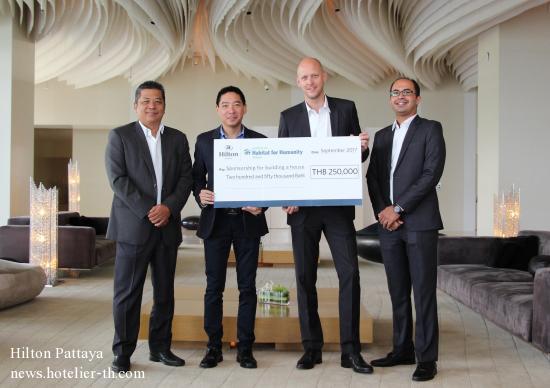 Hilton Pattaya Donates THB 250,000 to Habitat for Humanity ThailandHilton Pattaya led by Mr.Rudolf Troestler, General Manager (2nd from the right) has joined with Habitat for Humanity Thailand in supporting THB 250,000 for sponsorship of building a house for family in need in Chonburi.Moreover, Hilton Pattaya’s volunteers also participated with the team from Habitat of Humanity Thailand in surveying the local area, meeting with the selected family and building the house, The ‘Teddy for Charity’ campaign has been established since 2015 incorporated with Habitat for Humanity Thailand to support the hotel’s mission for social responsibility and strengthen the local community. The main purpose is to donate funds raised from the sale of teddy bears for charity. The previous projects included a playground for autistic children and a house for local family in Pattaya. Photo from left: Mr. Montree Sattham, Director of Human Resources, Hilton Pattaya Mr. Timothy Loke, CEO of Habitat for Humanity Thailand Mr. Rudolf Troestler, General Manager, Hilton Pattaya Mr. Ashwin Bhat, Director of Business Development, Hilton Pattaya
