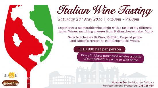 Havana Bar brings back the famous Italian Wine Tasting to townPATTAYA, Thailand – 16 May 2016 – Holiday Inn Pattaya in partnership with Bangkok Beer and Beverage Co., Ltd. offers guests an opportunity to discover fine wines from Italy on Saturday 28th May 2016 from 06.00pm – 9.00pm at Havana Bar.Paired with an exclusive selection of international cheeses and canapés created to compliment the wine at the spectacular Havana Bar, Holiday Inn Pattaya. Priced at only THB 990 net/person. Every two tickets purchased receives a bottle of complimentary premium wine. Guests can also bring home their favorite selection of great wines at a special price on the night. Enjoy signature wine evening in Pattaya on Saturday 28th May 2016 from 06.00pm – 9.00pm at Havana Bar, Holiday Inn Pattaya. For more information or reservations please call 038 725 555 or email: havanabar@holidayinn-pattaya.com