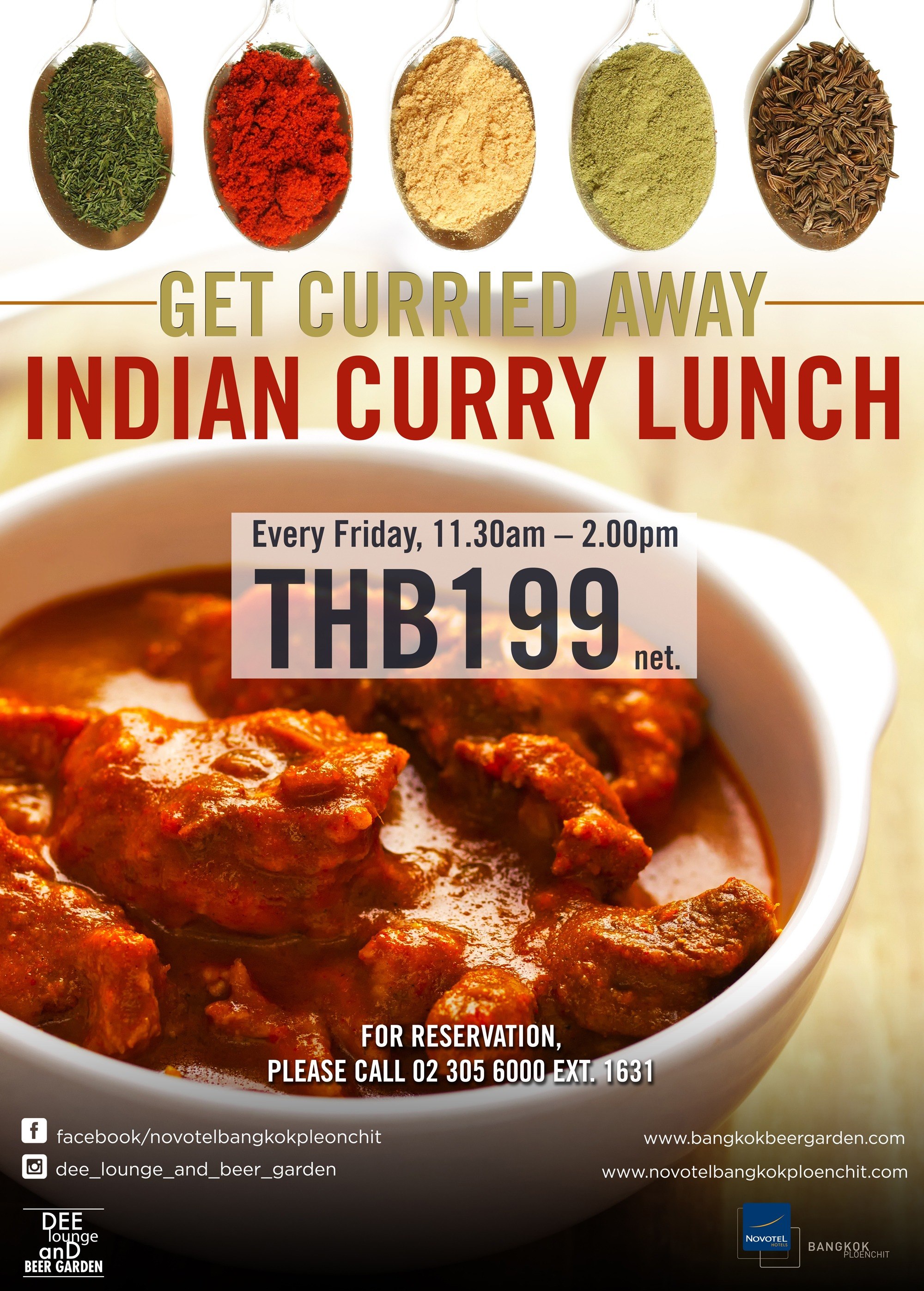 “Get Curried Away” Every Friday – Indian Curry Lunch at Dee Lounge and Beer GardenFriday lunch time means the work week is almost complete and the weekend nears. It’s when the mood begins to shift – and so it’s a great time to try something different for lunch.Dee Lounge and Beer Garden at Novotel Bangkok Ploenchit Sukhumvit catches the culinary mood with Get Curried Away – Indian Curry Lunch. From now to the end of December, enjoy flavourful Indian specialities every Friday for only THB 199 net per person. Menu highlights include savoury beef rendang; succulent lamb rogan josh and vindalo; delicious chicken and prawn curries; and vegetarian choices including dal dishes, aloo capsicum and others. Accor Advantage Plus members receive a 10% discount. Get Curried Away – Indian Curry Lunch at Dee Lounge and Beer Garden Date: Now to end December 2014, every Friday Time: 11.30am - 2.00pm Price: THB 199 net per person (includes 10% service charge and VAT) Reservation: 02 305 6000 ext. 1631, email: H7176@accor.com Visit us: www.novotelbangkokploenchit.com/special-offers/dee-lounge-beer-garden/ Post Date: Tue, 04 Nov 2014 11:25:25 +0700 |
