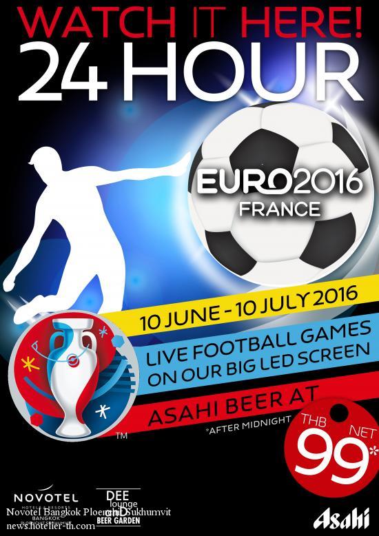 Watch UEFA Euro 2016 Live at Dee Lounge Beer GardenFor anyone seeking a great place to catch UEFA Euro 2016 matches – and that means every match day or night Bangkok time – then the goal is easily obtained. Just get to Dee Lounge & Beer Garden at Novotel Bangkok Ploenchit Sukhumvit for big-screen broadcasts 24 hours a day during the entire tournament.That’s right, from 10 June to 10 July 2016 Dee Lounge & Beer Garden is open 24/7 and showing live matches all night and into the morning, as well as replays in daytime and between live broadcasts. Watch matches indoors on the lounge’s 75-inch TV. Also only for Euro 2016 is a special on Asahi draught beer at THB 99 per glass from midnight to morning. A full drinks menu likewise will be available all hours. For meals and snacks, guests can place menu orders until midnight and free popcorn will be served throughout the night. UEFA Euro 2016 at Dee Lounge Beer Garden at Novotel Bangkok Ploenchit Sukhumvit Date: 10th June – 10th July 2016 Happy Hour: 12:00 – 7:00 am. Price: Asahi Beer at THB 99.-net/glass Reservation: 02 305 6000 ext. 1631 Website: www.bangkokbeergarden.com