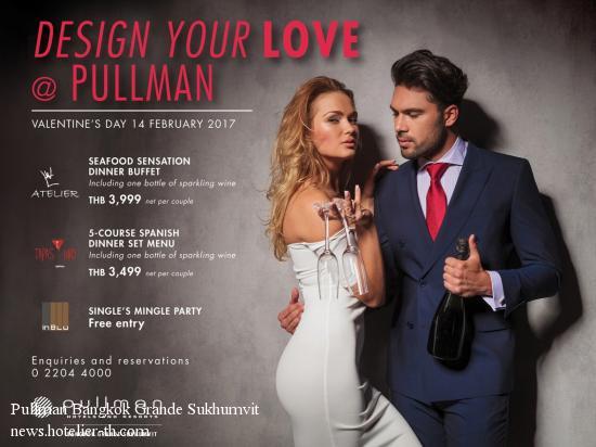 ‘DESIGN YOUR LOVE @ PULLMAN’ ON VALENTINE’S DAY 2017Love is in play and very much up to you at Pullman Bangkok Grande Sukhumvit this Valentine’s Day.Pullman Bangkok Grande Sukhumvit presents a playground of love where you can enjoy the most romantic day of the year with three distinct venue choices for a Valentine’s to remember: ATELIER Lavish love, lavish buffet. Atelier restaurant presents a sumptuous spread of international cuisines and sensational seafood. Highlights include seafood delicacies grilled and on ice, luscious desserts including chocolate fountain, and much more. THB 3,999 net per couple including one bottle of sparkling wine. Also complimentary chocolate lollipop and flower. Served 6.00 p.m. to 10.30 p.m. (15% early bird discount for pre-paid bookings made before 10 February 2017. Accor Plus members receive 25% discount.) TAPAS Y VINO Put some Spanish emoción into Valentine’s Day with a five-course dinner designed by Executive Chef Pedro Carrillo. THB 3,499 net per couple including one bottle of sparkling wine. Also complimentary chocolate lollipop and flower. Served 6.00 p.m. to midnight. (15% early bird discount for pre-paid bookings made before 10 February 2017. Accor Plus members receive 25% discount.) INBLU BAR No one special on Valentine’s Day? Don’t be blue. Instead head to InBlu bar’s Single’s Mingle party featuring live music, DJ and party games. Special offer for ladies: one complimentary glass of sparkling wine when arriving between 6.00 p.m. and 8.00 p.m. Free entry all night. Party hours: 6.00 p.m. to midnight. For enquiries and reservations, please phone: 022044000.
