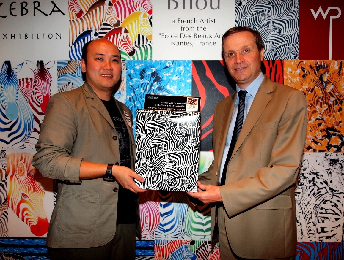 Pullman Bangkok King Power gives donation for the Wild Animal Rescue Foundation of ThailandPullman Bangkok King Power hotel recently launched the ‘Zebra’ exhibition showcases over 30 masterpieces by the artist Bilou at Wine Pub. Mr. Bilou had generously donated two of his works for the auction, of which all money raised gave to the charity to support the Wild Animal Rescue Foundation of Thailand on opening day.Photo shows: Mr. Marc Begassat, General Manager of the hotel (on the right) gave a donation Khun Thanaphat Payakkaporn (on the left), Project Manager of the foundation The exhibition will last until July 31, 2011 from 6.00 pm to 2.00 am, everyday at Wine Pub, Pullman Bangkok King Power hotel. For more information, please call 02 680 9999. Please see more photos of the event in the link below ka. www.flickr.com/photos/prpullmankingpower/sets/72157627035087402/