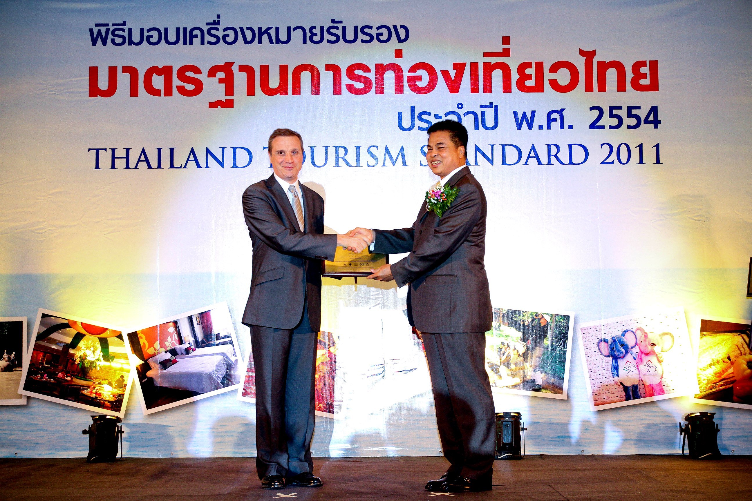 Pullman Bangkok King Power receives the Thailand Tourism Standard 2011Mr. Marc Bagassat, General Manager, Pullman Bangkok King Power hotel (left) recently received Thailand Tourism Standard 2011 Certificate from Mr. Sombat Kurupan, Permanent Secretary of Ministry of Tourism and Sports (right) on a five star hotel standard, organized by department of Tourism, Ministry of Tourism and Sports at Queen Sirikit National Convention Center.| โรงแรมพูลแมน คิง เพาเวอร์ กรุงเทพ ได้รับการรับรองมาตรฐานการท่องเที่ยวไทย ๒๕๕๔ | | มร. มาร์ค เบกาสาท ผู้จัดการทั่วไป โรงแรมพูลแมน คิง เพาเวอร์ กรุงเทพ (ซ้าย) เข้ารับมอบเครื่องหมายรับรองมาตรฐานการท่องเที่ยวไทย ประจำปี พ.ศ. ๒๕๕๔ นายสมบัติ คุรุพันธ์ ปลัดกระทรวงการท่องเที่ยวและกีฬา (ขวา) ในโอกาสที่ โรงแรมฯได้มาตรฐานที่พักเพื่อการท่องเที่ยว ประเภทมาตรฐานโรงแรม ระดับ ๕ ดาว จัดโดยกรมการท่องเที่ยว กระทรวงการท่องเที่ยวและกีฬา ณ ศูนย์ประชุมแห่งชาติสิริกิติ์ เมื่อเร็วๆ นี้ |
