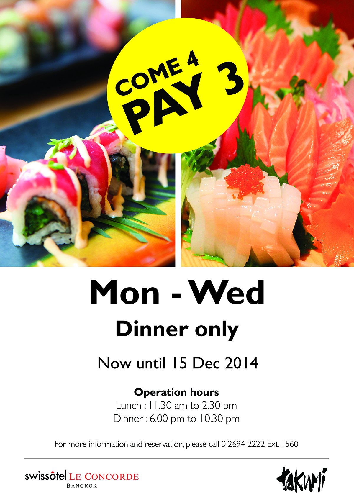 “COME 4 PAY 3” – HOT PROMOTION AT TAKUMITakumi Japanese Restaurant at Swissôtel Le Concorde Bangkok, Thank you for your well feedback over the past year. Takumi has a special promotion just paying for "Come 4 Pay 3" for dinner only on Monday - Wednesday. You can enjoy with a huge Japanese Buffet with high quality materials for food cooking in Japanese style such as Sashimi, Sushi, Teppanyaki, Shabu Shabu, Soup, Takoyaki, Meat Grill Sauce, Tempura, Fried noodles, Udon, also with drinks and desserts such as Pudding Milk and homemade ice cream such as Green Tea and Black Sesame, etc.A fantastic Japanese restaurant with a full menu for the gang lover to eat Japanese food. Enjoy unlimited buffet at dinner THB 890++ per person from Now until December 15, 2014 only. For more information and reservation please call +662 694 2222 ext 1560. Takumi is located on the ground floor of Swissôtel Le Concorde Bangkok. Takumi hours of operation: lunch 11.30 am – 14.30 pm and dinner 18.00 pm – 22.30 pm.