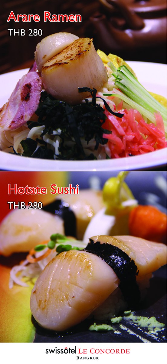 SIZZLING SCALLOPS - TAKUMIAlthough known to be easily found in all of the world’s oceans, scallops require a great art of cooking. And this is why our talented chefs at Takumi are preparing sizzling scallops throughout this April.Takumi Japanese Restaurant at Swissôtel Le Concorde Bangkok has two highly recommended menus from Scallop. Enjoy Hotate Sushi at THB 280 and Arare Ramen at THB 280. So hurry up and visit Takumi as our chef will be using “Scallop” to offer you. Also available daily is our ever-popular All-You-Can-Eat a-la-carte lunch and dinner buffet with over 100 varieties to choose from. For more information and reservation please call +662 694 2222 ext 1560. Takumi is located on the ground floor of Swissôtel Le Concorde Bangkok. Takumi hours of operation: lunch 11.30 am – 14.30 pm and dinner 18.00 pm – 22.30 pm.