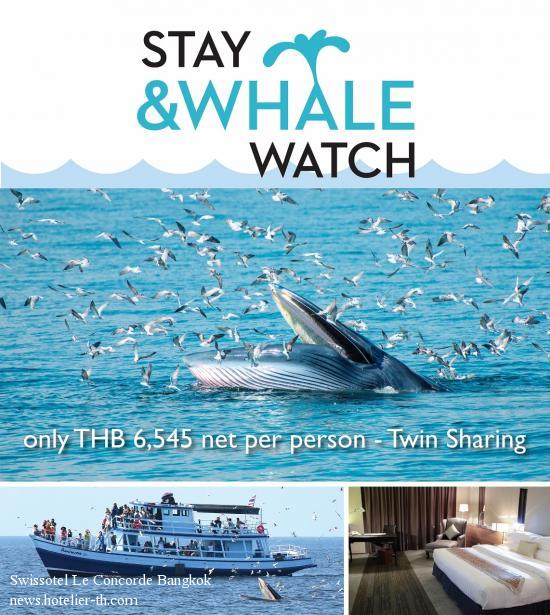 STAY & WHALE WATCH AT SWISSOTEL LE CONCORDE BANGKOKExperience a once-in-a-life-time trip with Swissôtel Le Concorde Bangkok‘s Whale Watching Package offering 2 nights’ accommodation and a whale watching tour for two adults.Delight in the sight of BRYDE’s whales in the month of December and January in the Gulf of Thailand by taking a whale watching cruise from a Pier that located just 45 minutes’ drive from the hotel (by express way). Learn all about these amazing mammals from expert English speaking tour guide. Swissôtel Le Concorde Bangkok is proud to be part of this whale watching activity which aims to create awareness and involvement in marine wildlife conservation, as well as; issues of surrounding marine pollution. Raise the level on your experience cost with our Whale Watching Package through www.swissotel.com/hotels/bangkok-concorde/promotions/ The package features overnight accommodations for two and two adult tickets for a day-long cruise. Swissôtel Le Concorde’s Whale Watching Package includes • Two nights’ accommodations for two in our brand new “NEW PREMIER“ room with welcome drink and Breakfast at 204 Bistro (Please inform our front office upon your check-in if you need breakfast box arranged on the cruising date). Plus, Special Turn down, complimentary Wi-Fi, Early check-in and late check-out. • 14 Days advance booking is required with full payment at the time of booking. The booking is non-refundable. • Van pick-up to-and-from hotel to the Pier. Departure times from hotel are around 6:00 a.m. Returning to hotel around 8.00-9.00 p.m. Lunch box, soft drink and drinking water provided on board. *alcohol is not allowed during the activity • Two adult whale watching cruise tickets for below cruise schedule with Whale Watching Boat, Captain, Staff, Marine Naturalist (English speaking) DECEMBER 2015 - Boat Schedule 20 Dec / Check-in & Check-out date: 19 & 21 Dec - Boat Schedule 26 Dec / Check-in & Check-out date: 25 & 27 Dec - Boat Schedule 27 Dec / Check-in & Check-out date: 26 & 28 Dec JAUNARY 2016 - Boat Schedule 9 Jan / Check-in & Check-out date: 8 & 10 Dec - Boat Schedule 10 Jan / Check-in & Check-out date: 9 & 11 Dec - Boat Schedule 16 Dec / Check-in & Check-out date: 15 & 17 Dec For more information and reservations please contact at +66 (0) 2694 2222 or e-mail reservations.bangkok@swissotel.com or click www.swissotel.com/hotels/bangkok-concorde/promotions/experiences/stay-and-whale-watch/ Hurry!!! Limited space available.