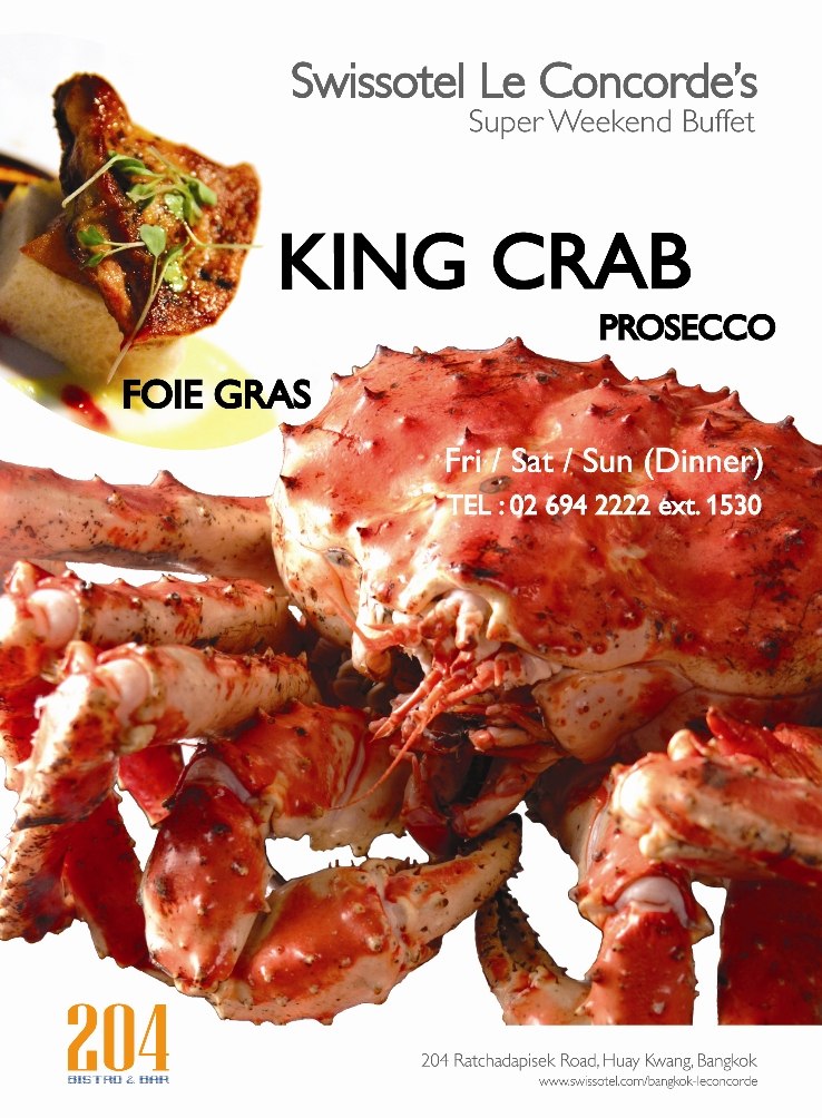 Weekend Super Buffet “Alaskan King Crab” at 204 Bistro&BarBack again with a great International Buffet at 204 Bistro & Bar, Swissôtel Le Concorde Bangkok. To highlight a spectacular buffet "Alaskan King Crab" for Dinner only on Friday, Saturday and Sunday from 18.00 hrs. - 22.30 hrs. For those who adore fresh Alaskan King Crab with good taste, good texture and good quality are served you to unlimited, special with complimentary a glass of White Wine is giving away to all guests who join our dinner buffet which you can enjoy the International Buffet along with fine wines in an elegant setting. For dinner buffet only at THB 990++ per person, start from Friday, November 14, 2014 onwards.Moreover you can enjoy with elegant international dinner buffet such as Thai, Chinese, Japanese, Seafood and many interesting desserts. We offer you loads and loads of delicious food and drinks together. 204 Bistro&Bar is located at the ground floor of Swissôtel Le Concorde Bangkok. For more information and reservation please call +662 694 2222 ext 1530.