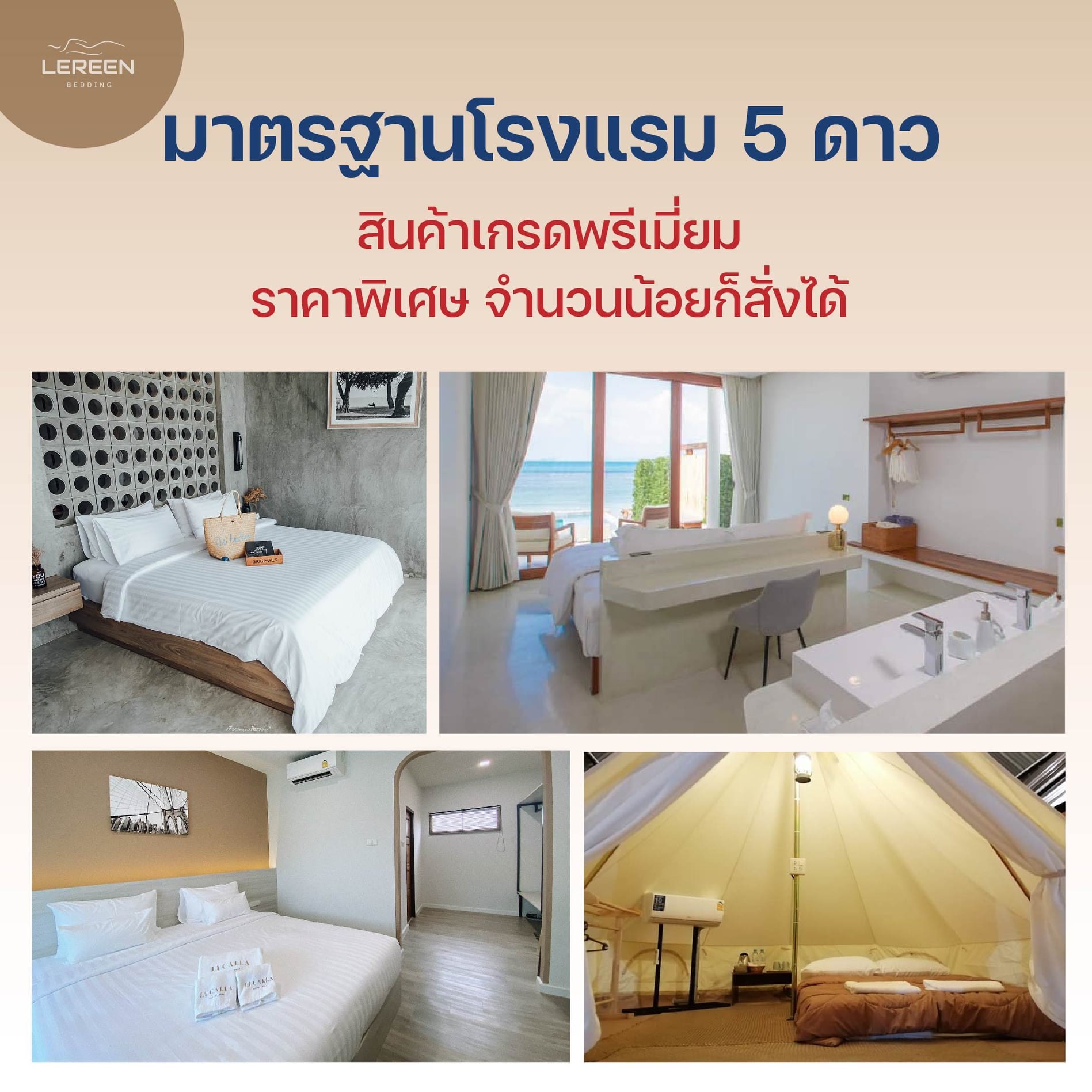 | Company Description | | เลอรีน ผู้เชี่ยวชาญเรื่องการนอน บริการคุณได้ครบทั้งที่นอน Topper หมอนคุณภาพ ชุดผ้าปูที่นอน ปลอกหมอน และอื่นๆ ที่ได้มาตราฐานระดับ 5 ดาวสำหรับโรงแรม รีสอร์ต และสปา โดยเรามีเนื้อผ้าหลากหลายให้คุณเลือกสรร ซึ่งเราผลิตและออกแบบด้วยวัสดุที่มีคุณภาพ มาพร้อมกับราคาที่คุ้มค่า ตอบโจทย์กับความต้องการในเชิงธุรกิจ LEREEN เข้าใจความต้องการ และสามารถแนะนำสิ่งที่เหมาะสมให้กับผู้ประกอบการแต่ละกลุ่มได้ |